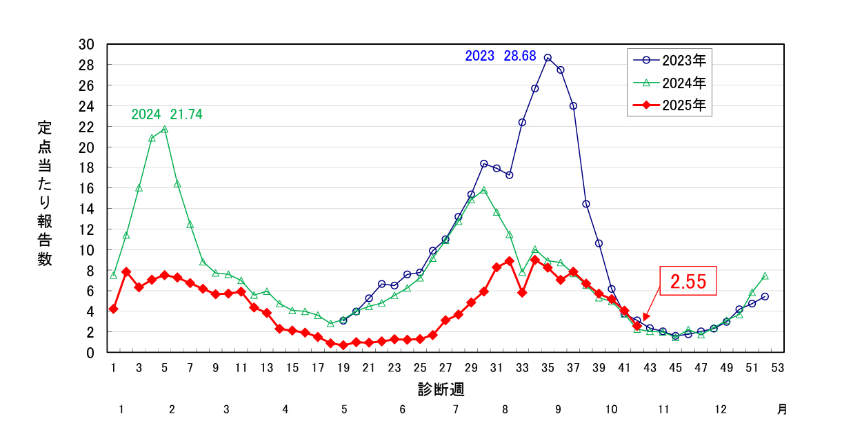 2025 年第42週の千葉県の新型コロナウイルス感染症の定点当たり報告数:2.55人